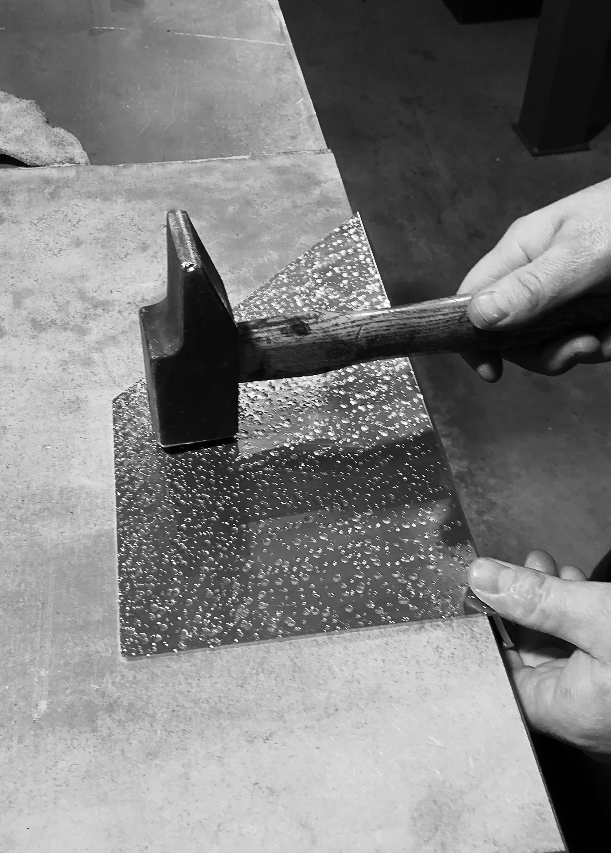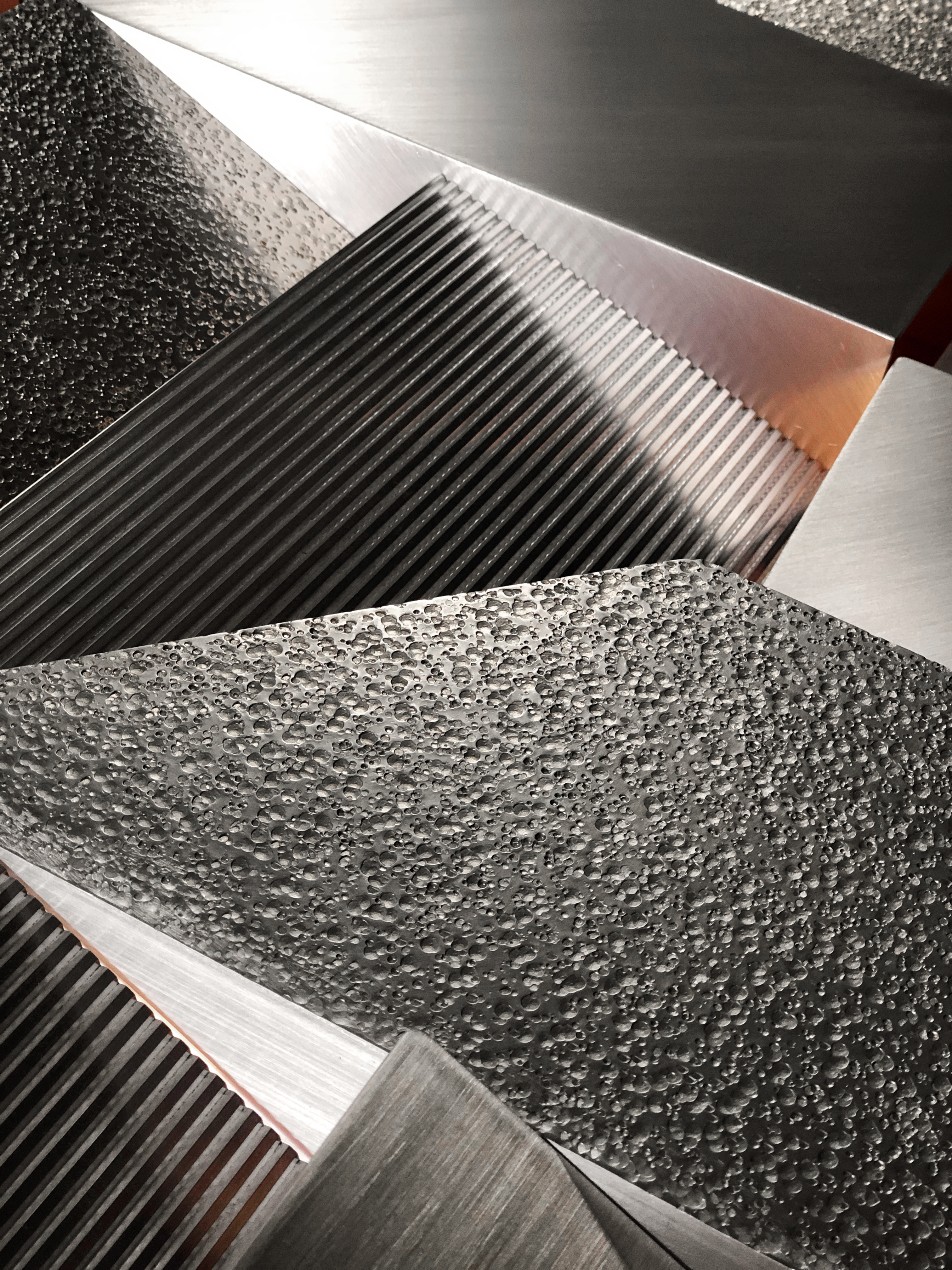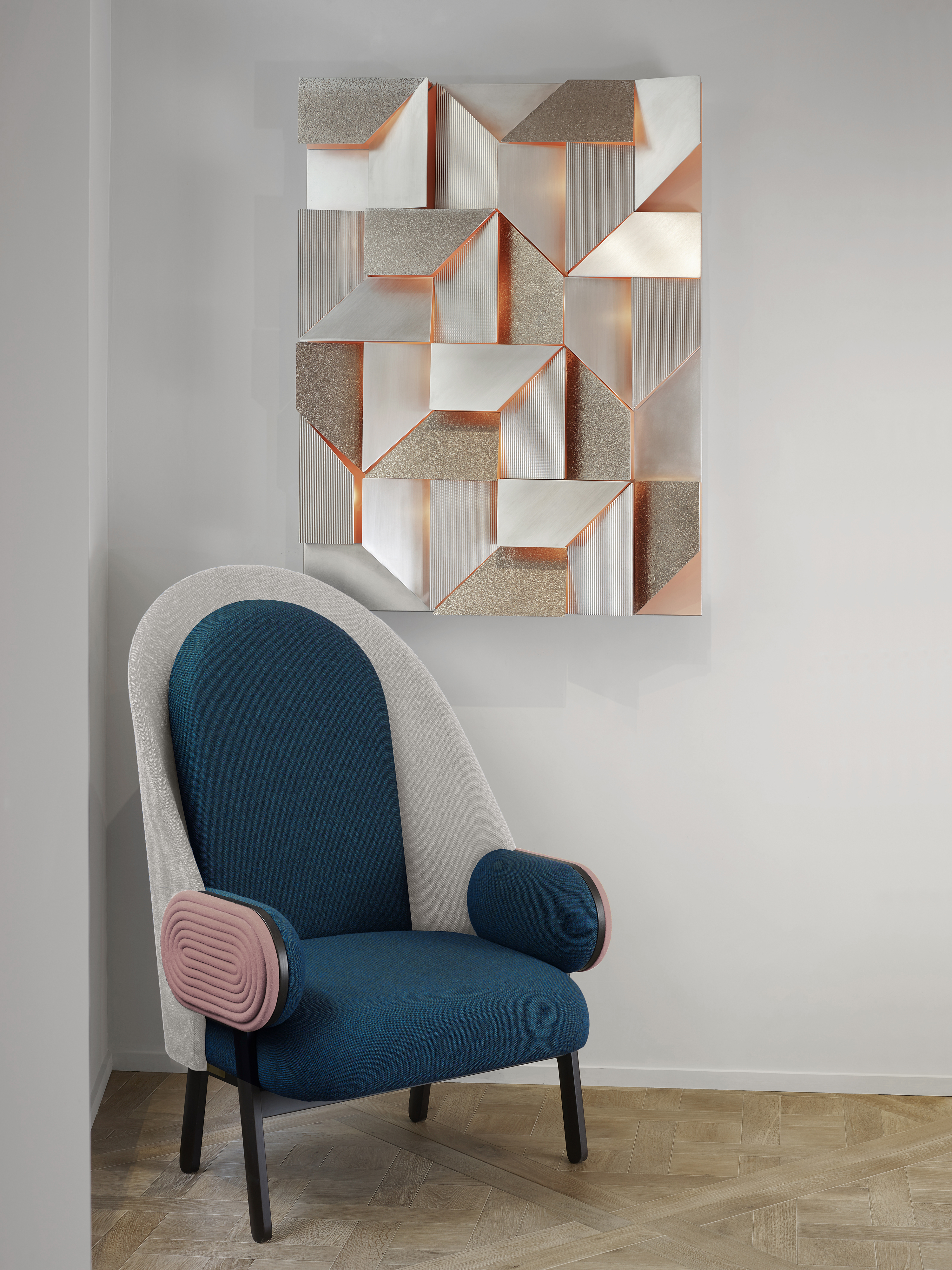 Brushed, hammered, guilloched and lacquered aluminium and LED light.